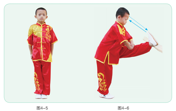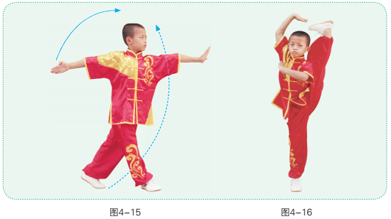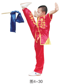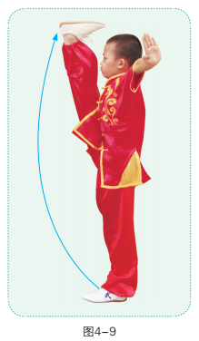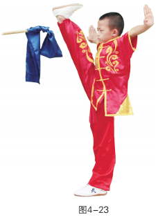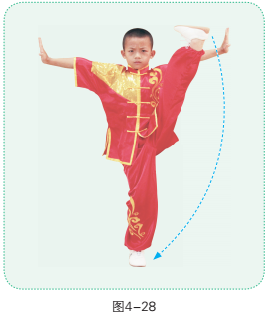 2.右脚向前上半步,左脚脚尖勾起,向右侧上方踢起(图4-27 )。