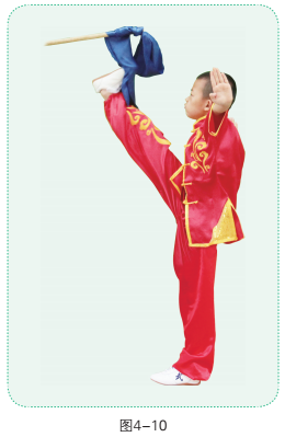 学一学、练一练:在一定高度设置目标,踢腿击物。高度逐渐提升。(图4-10)。