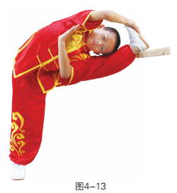 学一学、练一练:直腿侧身向前、向下压振,逐步过渡到上体侧卧在被压腿上(图4-13)。