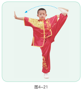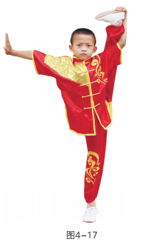 练习提示:练习提示踢腿时要支撑腿外展,上体正直侧身。(图4-17)。