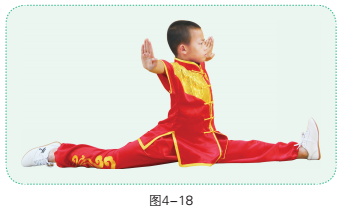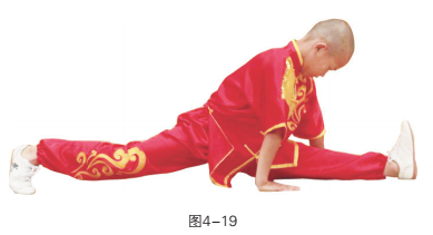 学一学、练一练:在练习竖叉动作时采取双手扶地压振,逐步下劈,提高柔韧性,防止腿部韧带拉伤。(图4-19)。