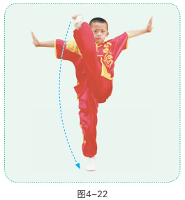 3.经面前向右侧上方直腿摆动,落于右脚外侧。目视前方(图4-22)。