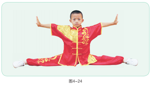 两手在体前牧地或两臂侧平举,两腿左右分开成直线,脚内侧着地(图4-24)。