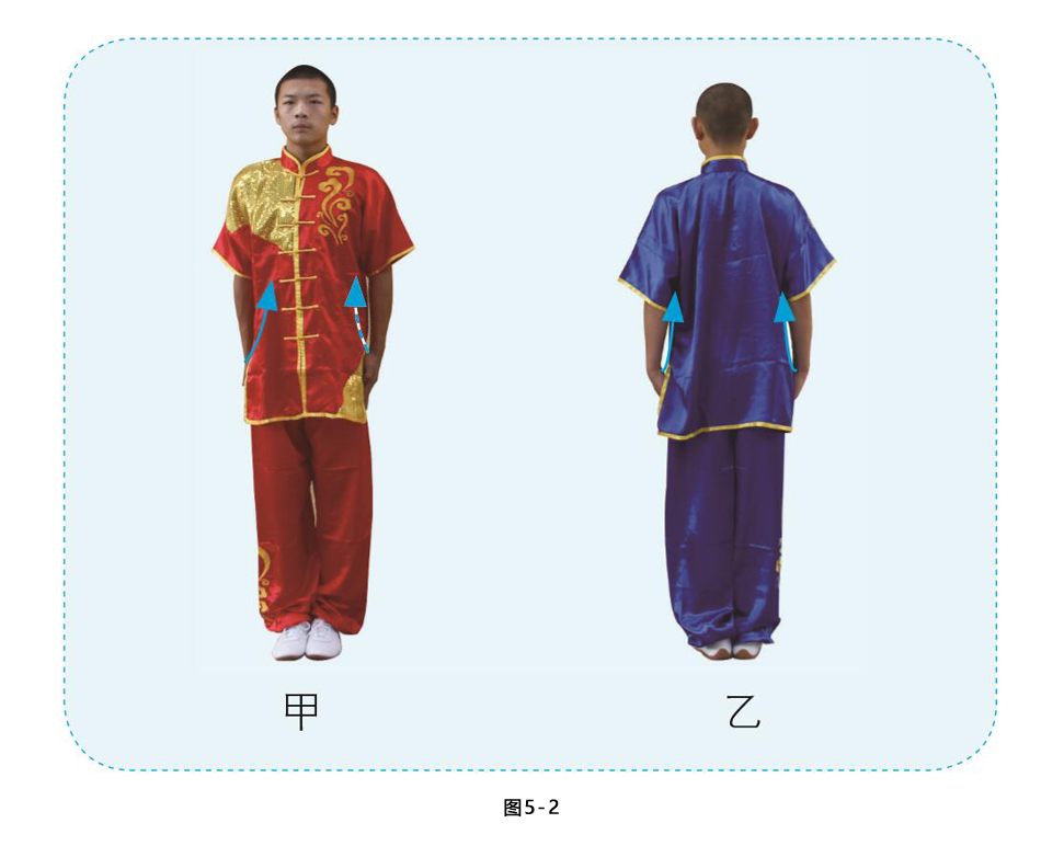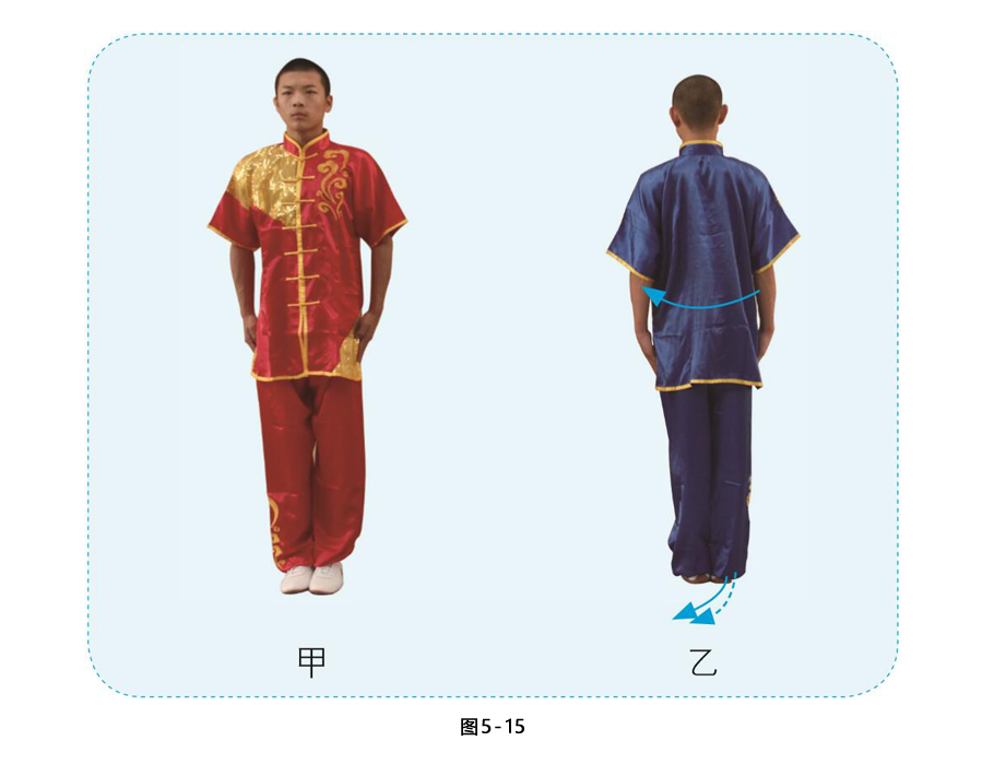 2.甲乙两拳变掌,两臂自然垂于体侧,目视前方。 (图5-15)