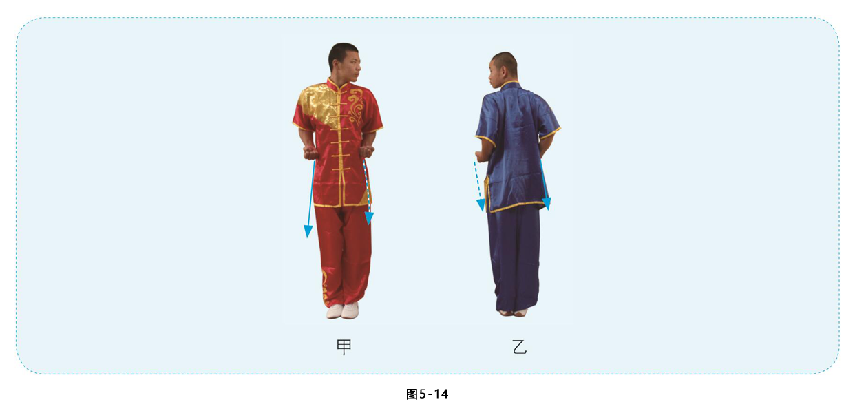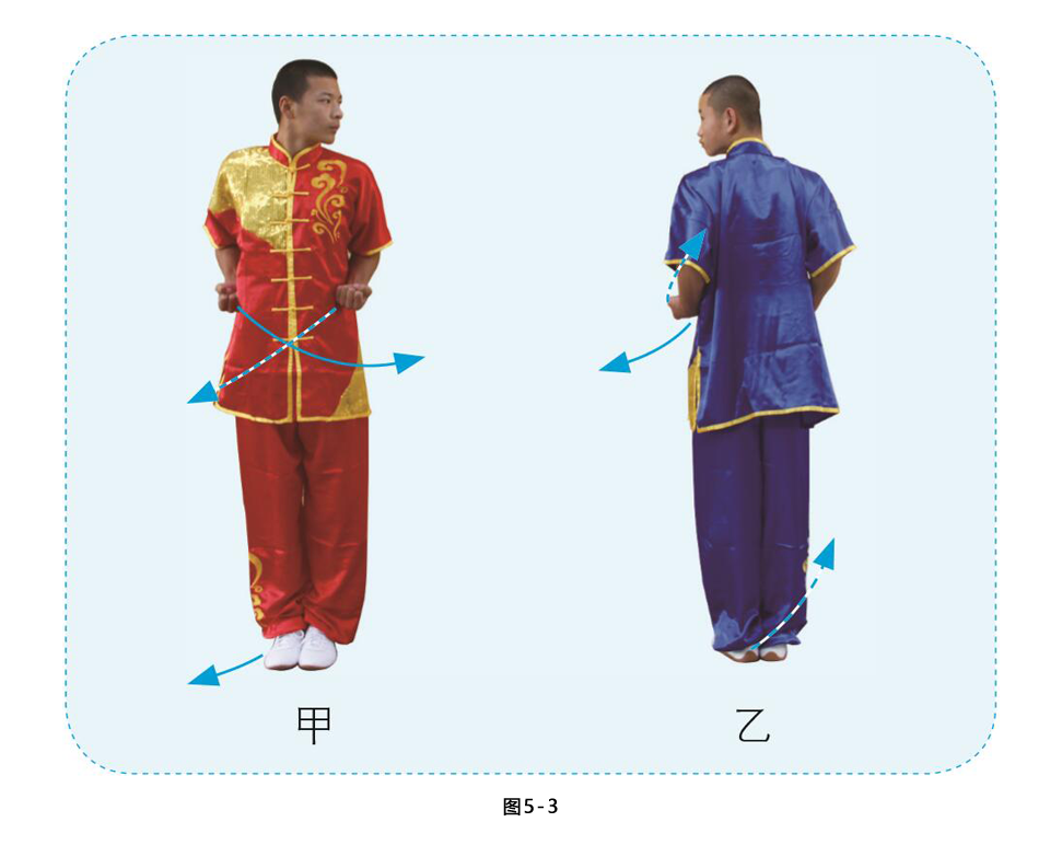 甲乙相距1米左右,并排直立,目视前方。乙向后转,两人相对而立。 (图5-1、图5-2)