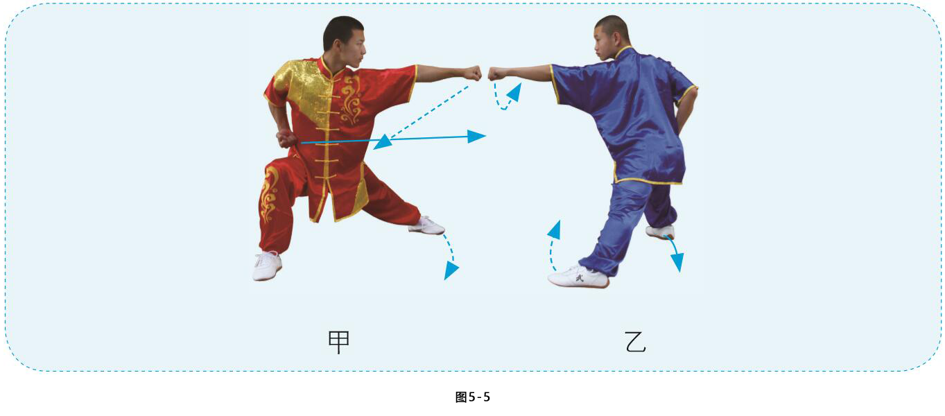 甲左脚上步成左弓步,右拳向乙胸部冲出,力达拳面,高于肩平, 左拳收抱腰间,目视乙方。乙身体略右转,右脚后收活步,两腿屈膝成马步;左臂屈肘外旋,以前臂内侧向内横格甲右臂,目视甲方。(图5-6)