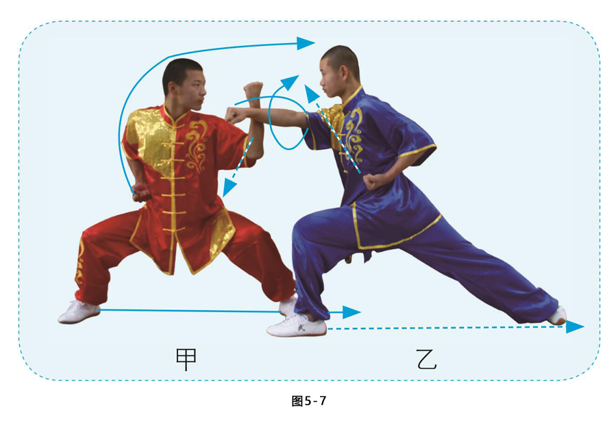 乙左臂下压甲右臂,蹬腿左转成左弓步;右拳向甲胸部冲出,拳心朝下,力达拳面,目视甲方。甲向右转 身,左脚回收内扣,屈膝成马步;左臂屈肘外旋,向内横格挡乙右臂,右臂收抱腰间,目视乙方。(图5-7)