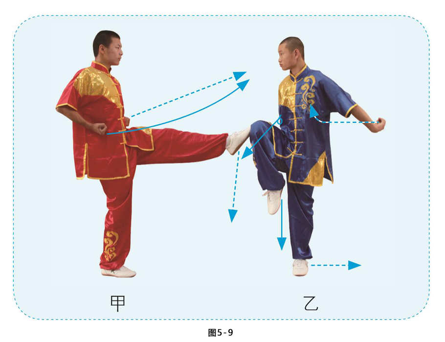 甲重心前移,左腿由屈到伸向乙弹踢,脚面绷平,力达脚尖,右掌变拳收抱腰间,目视乙方。乙重心后移,右膝提起闪躲;两掌向下拍击甲左脚面而后顺势变勾手摆至身后,勾尖朝上,目视甲方。(图5-9)