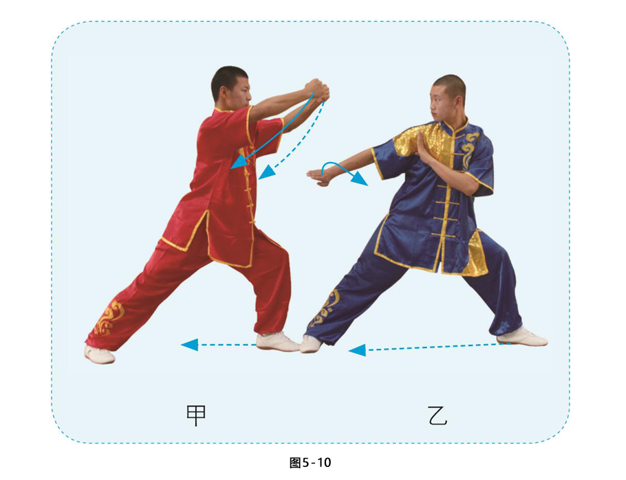 甲左脚前落成左弓步,两拳经体侧向乙头部横贯,拳眼斜朝下,力达拳面,目视乙方。乙重心后移,右脚 落于左脚内侧,左脚向左侧上步成左弓步;右勾手变掌向甲膝关节处切击,屈肘摆至胸前,力达掌外沿;左掌摆至右肩内侧成立掌,掌心朝外,目视甲方。(图5-10)