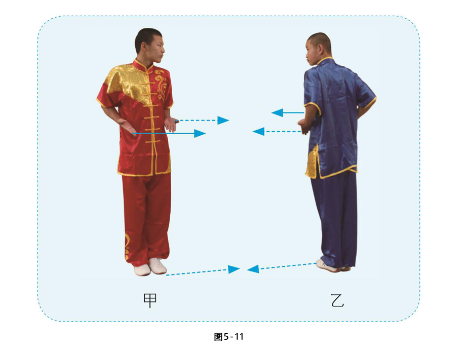1.甲重心后移,左脚回收成并步;两拳变掌外旋向下掸拨乙右手后收至腰间,掌心朝上,目视乙方。乙身体右转,左脚收至右脚成并步;两掌外旋下掸后收至腰间,掌心朝上,目视甲方。 (图5-11)