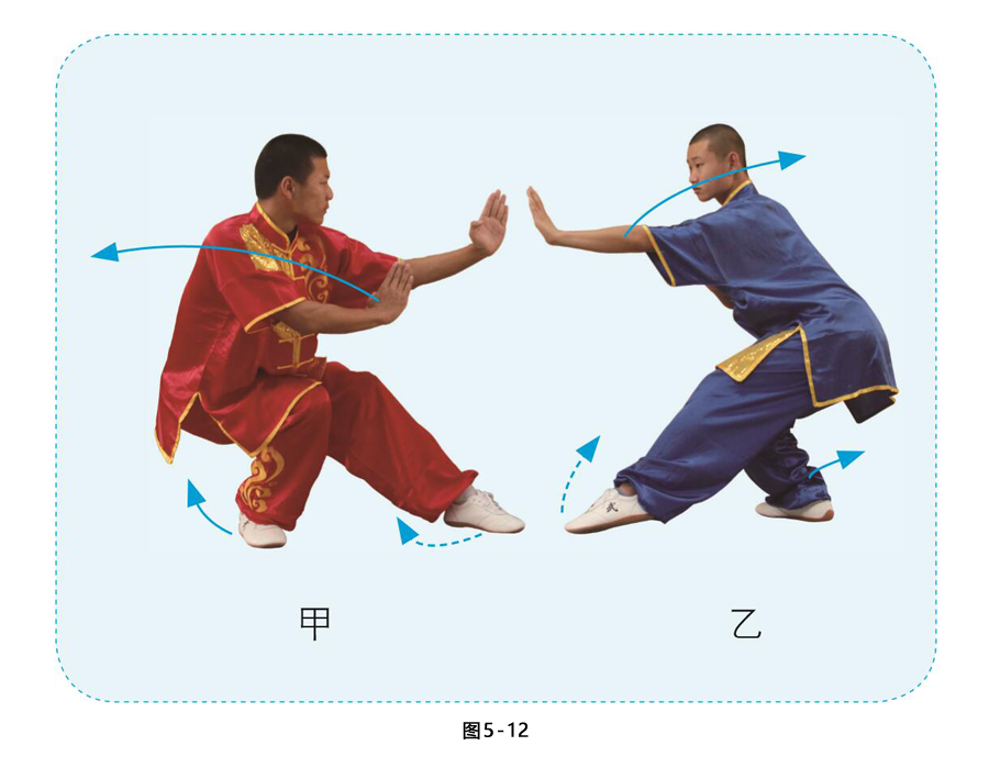 2.甲乙右腿屈膝下蹲,左脚前伸成左虚步;两掌向前推出, 右臂微屈,右掌附于左肘内侧, 目视对方。(图5-12)