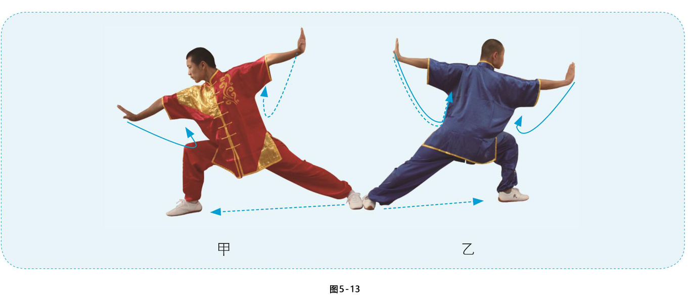 1.甲乙重心右移,两脚碾地,身体右转,右臂经上向身体右侧打开,目视右手;左脚迅速向右脚并拢,两腿直立,两掌变拳收抱腰间,向左摆头, 目视对方。(图5-13、图5-14)