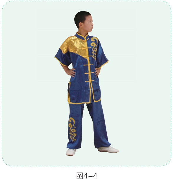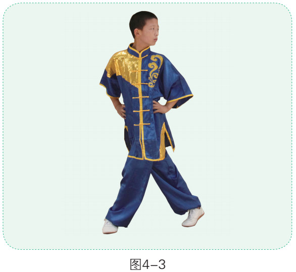1.两脚前后开立,与肩同宽,两手叉腰(图4-4)。