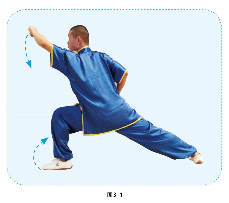左脚上步成左弓步,左掌变拳,左臂内旋向额前上方屈臂架起,右掌变拳收抱腰 间,目视前方。(图3-1)
