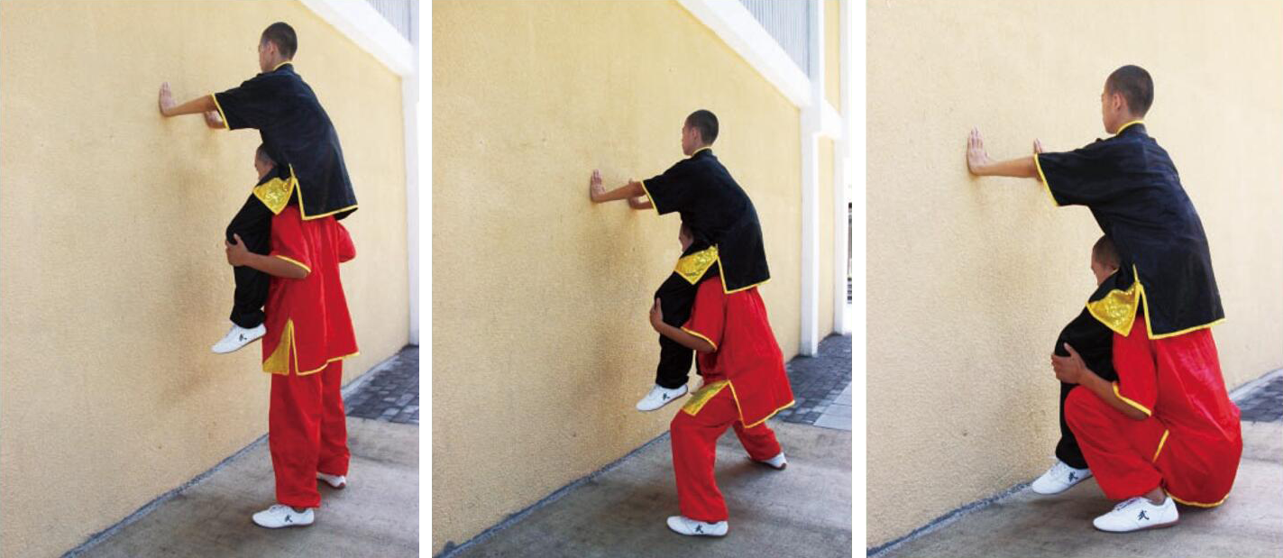 双人较臂练习:两人面对面,各自前后脚开立成半弓步姿势,脚掌 外侧相抵,互握手腕做前后推拉和左右拧扯等动作,力争使对方失去平 衡,移动脚步或另一只手触地者即为输。