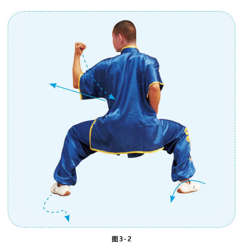 身体右转,左脚内扣,两腿屈 膝成马步;左臂屈肘外旋向前、内向横格,力达左前臂内侧,目视格挡方向。(图3-2)