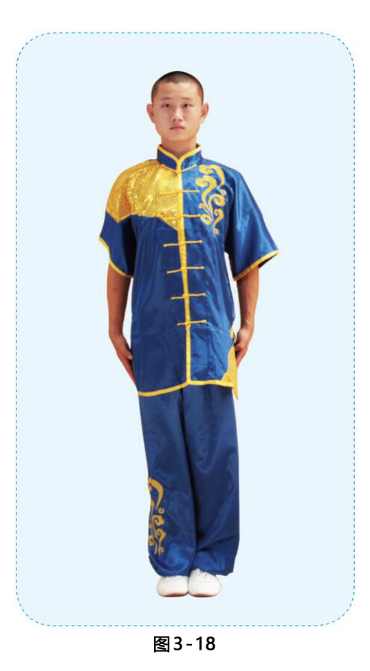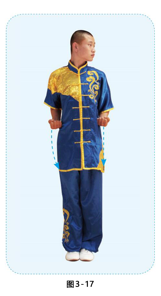 1.身体微右转,左脚收至右脚内侧成并步;两臂前摆下掸回收至腰间,目视前方。(图3-14)