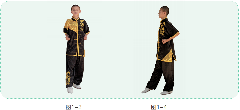 1.两脚并步站立,两手抱拳于腰间(图1-1)。