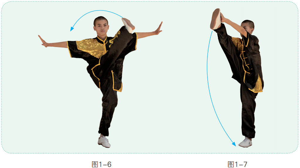 2. 左脚向前上半步,右腿向左侧上方踢起,经面前向右侧上方直腿摆动,同时两手在额前依次迎拍脚面,击拍两次(图1-6、图1-7)。