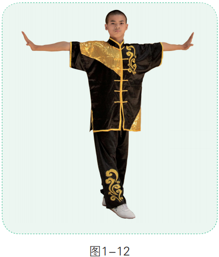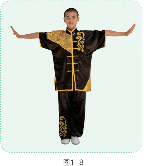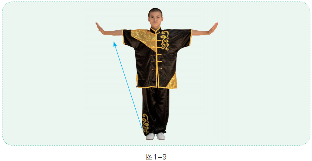 1. 身体直立,两手左右平架,指尖向上,掌心朝外(图1-9)。